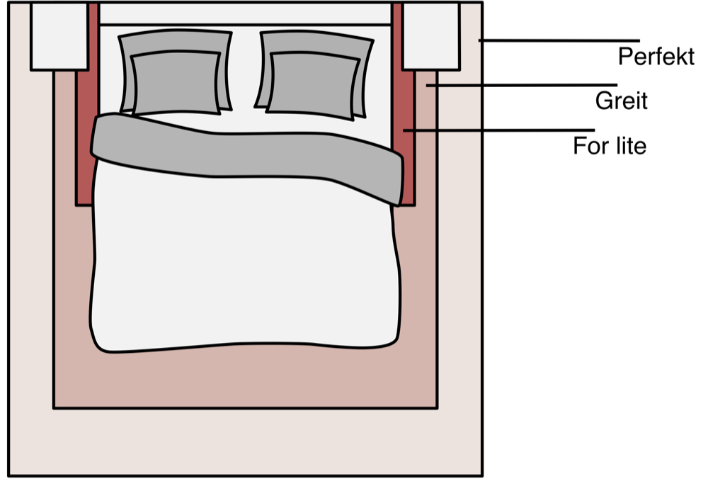 Størrelse på seng og rom er viktige faktorer når du skal finne riktig teppestørrelse til soverommet. Teppet kan med fordel gå godt ut på hver side, rundt 50 cm. anbefales. Løpere på hver side og/eller ved fotenden er også et godt alternativ.